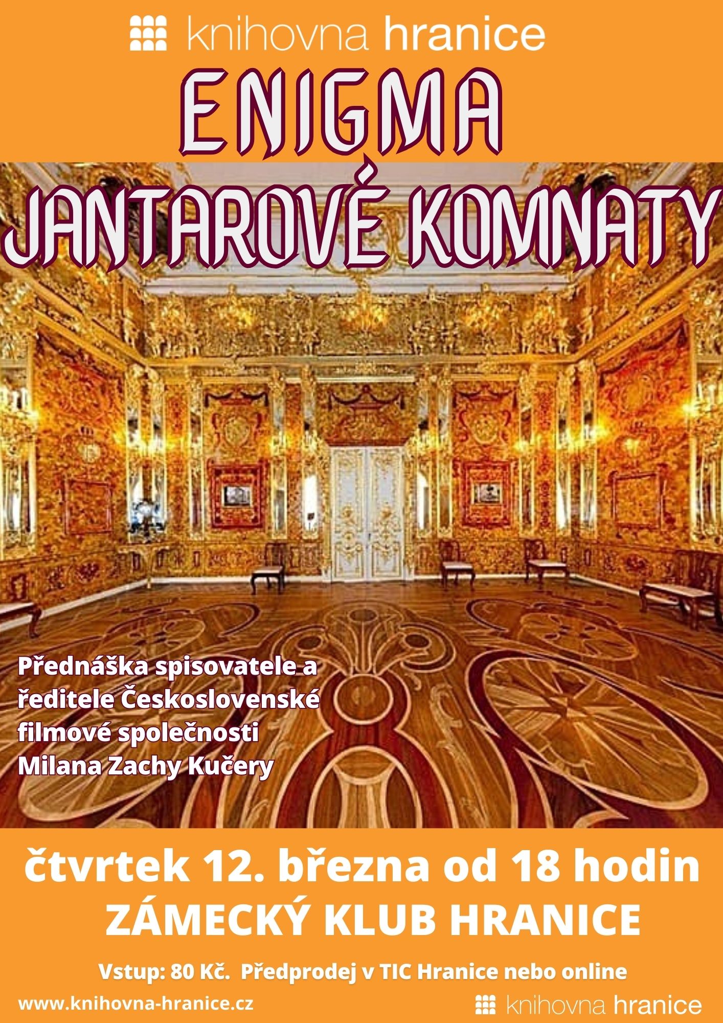 Milan Zacha Kučera se vrací do Hranic s přednáškou Enigma Jantarové komnaty, která se uskuteční ve čtvrtek 12. března od 18 hodin v Zámeckém klubu. Vstupné je 80 Kč. Vstupenky zakoupíte v Turistickém informačním centru a online.