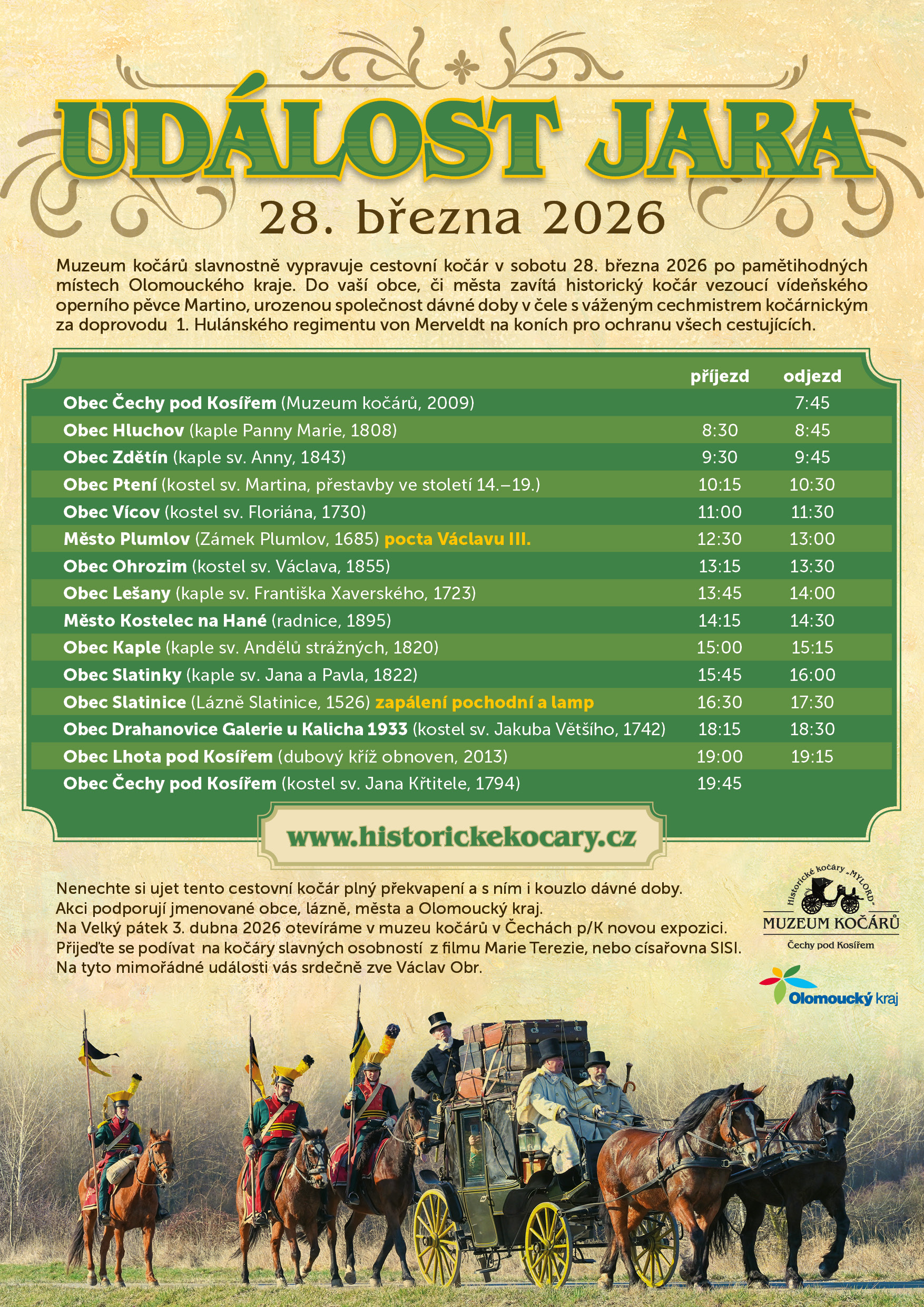 V sobotu 28. března Muzeum historických kočárů slavnostně vypravuje cestovní kočár po pamětihodných místech Olomouckého kraje. Během jízdy kočár bude několikrát zastavovat, k vidění bude zapřahání a přepřahání koní i jejich krmení. Kočár bude doprovázet jízdní hlídka 1. hulánského regimentu.