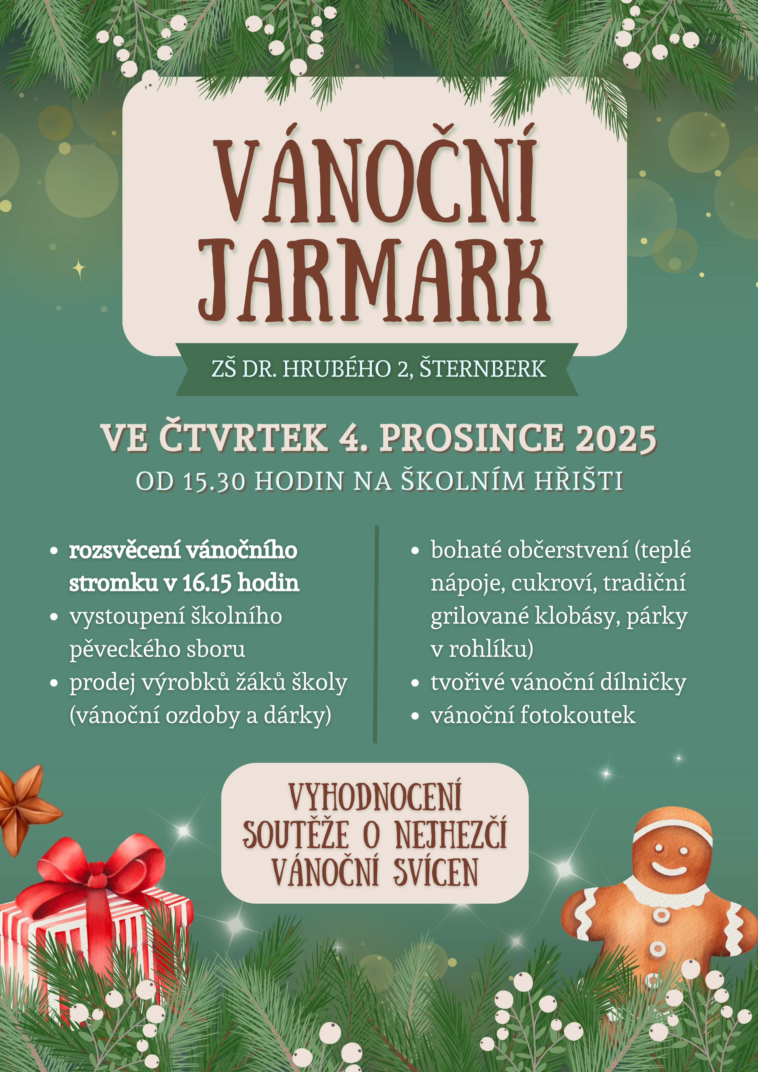 Návštěvníci si budou moci zakoupit některý z vánočních výrobků žáků nebo si pochutnat na vynikajících pečených klobásách či párku v rohlíku a zahřát se horkými nápoji pro děti i dospělé. Na programu je také pěvecké vystoupení školního sboru a tradiční rozsvěcení vánočního stromku. Letos proběhne soutěž o nejhezčí (či nejoriginálnější) vánoční svícen, do které se může zapojit i veřejnost – v případě zájmu prosíme o doručení výrobku do kanceláře školy nejpozději 3. 12. 2025 s uvedením jména autora. Na akci srdečně zveme!
