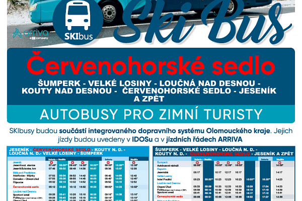 Máte chuť vyrazit na běžky a ochutnat jesenickou magistrálu, nebo okruhy na Červenohorském sedle anebo se vydat upravenou spojkou až na Dlouhé Stráně? Není nic jednoduššího než se mrknout na idos a vybrat si jeden ze spojů našeho skibusu. Skibus pojede každý víkend až do března. Spoje navazují na příjezdy vlaků a ostatní spoje stejným směrem.