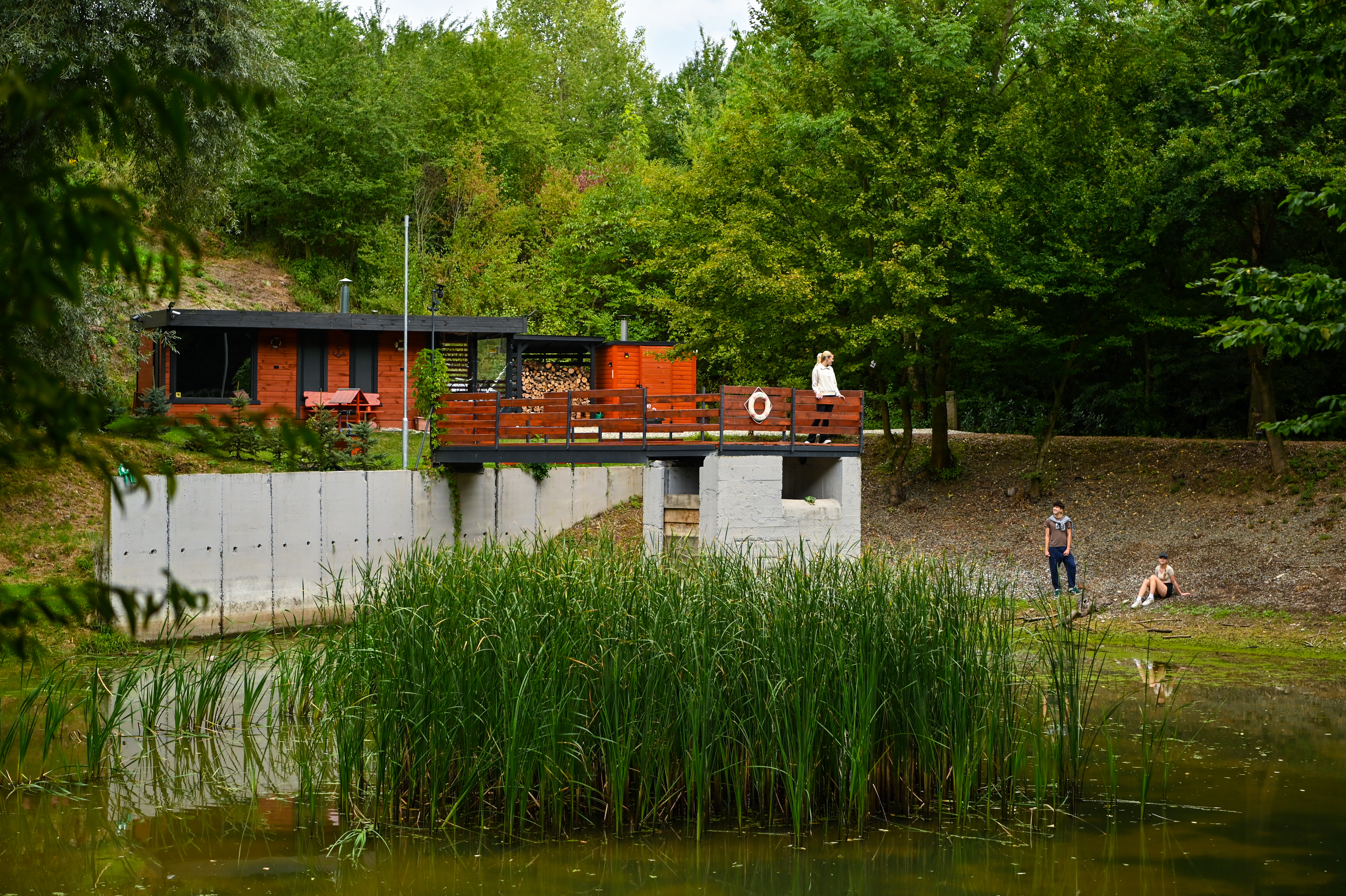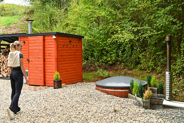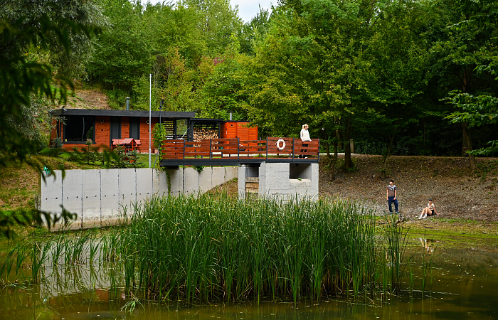 Glamping U Žabky położony jest nad brzegiem małego stawu w pobliżu zapory Plumlov. Drewniany domek wyposażony jest w podwójne łóżko, małą szafkę z podstawowymi naczyniami, lodówkę, kuchenkę mikrofalową i chłodziarkę oraz przenośną kuchenkę gazową.